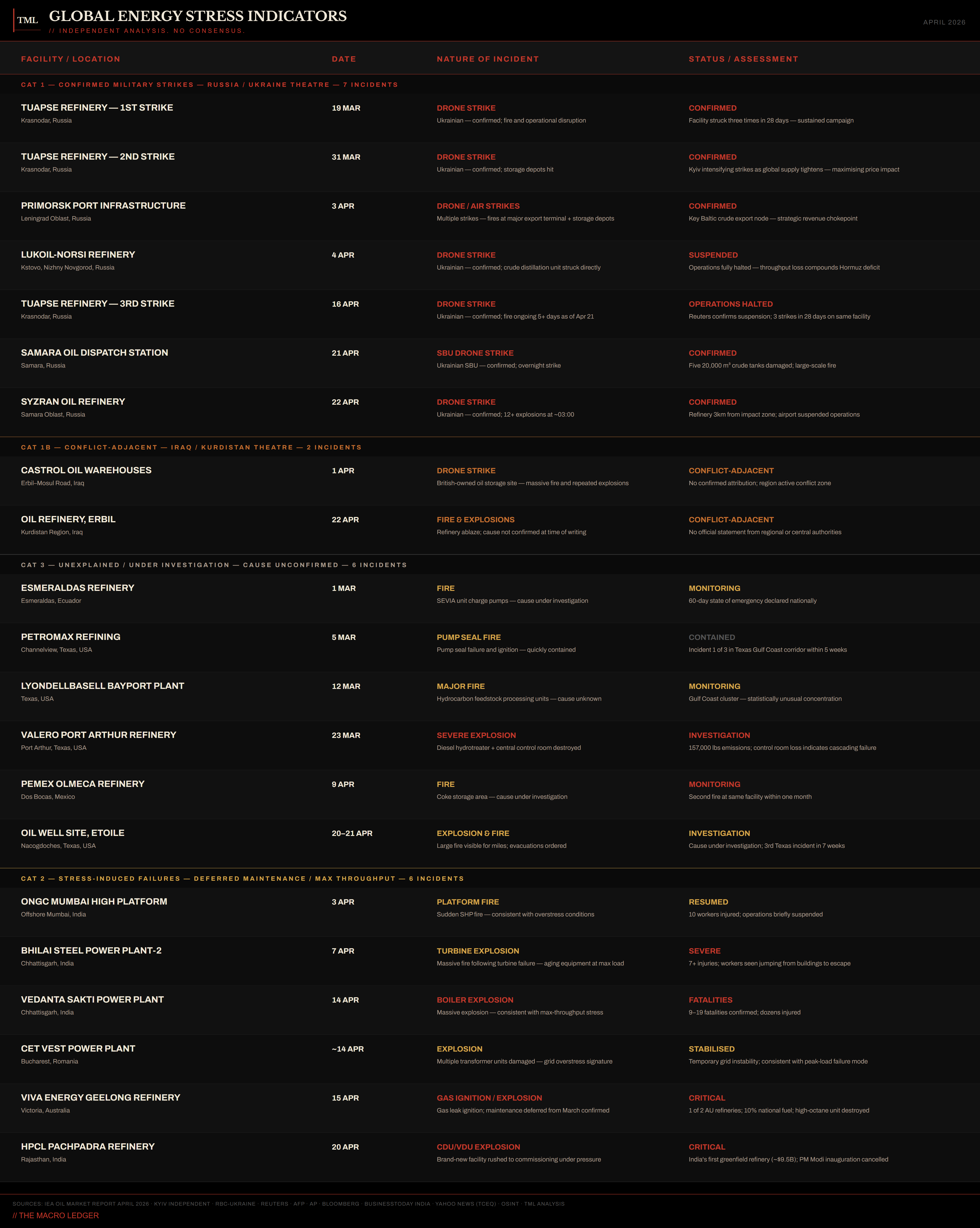 2 incidents sit between the confirmed and probable categories, both in Iraq's Kurdistan region: Castrol oil warehouses on the Erbil–Mosul road were struck by drone on 1 April — a massive fire and repeated explosions at a British-owned oil storage site, no claim of responsibility, an oil refinery in Erbil was ablaze on 22 April with no official statement from regional or central Iraqi authorities at time of writing, both have the characteristics of deliberate targeting rather than systemic stress failure, and neither fits cleanly inside the Ukraine campaign or the stress-failure taxonomy. Kurdistan's energy infrastructure has been a recurring target in the broader regional conflict, and the timing of the Erbil refinery incident — the same day as the Syzran strike — is not conclusive but is not unremarkable.